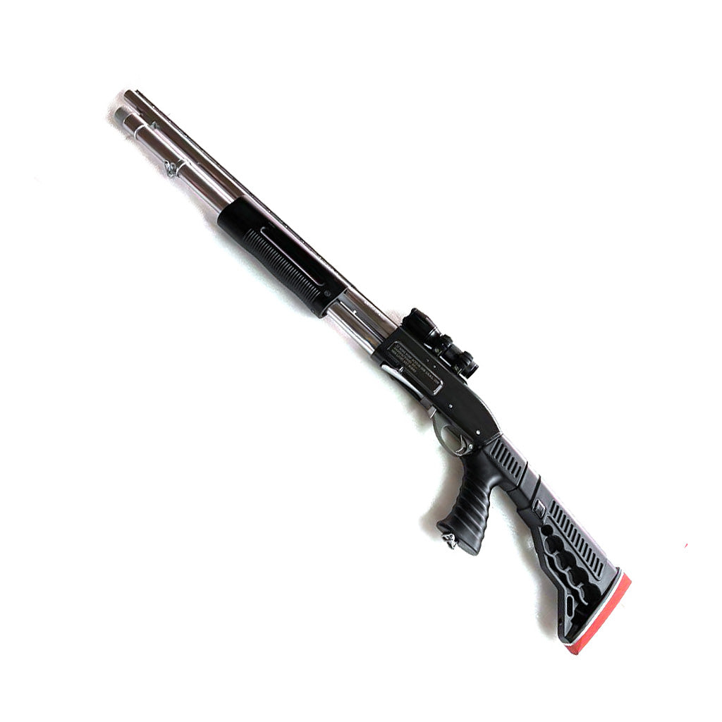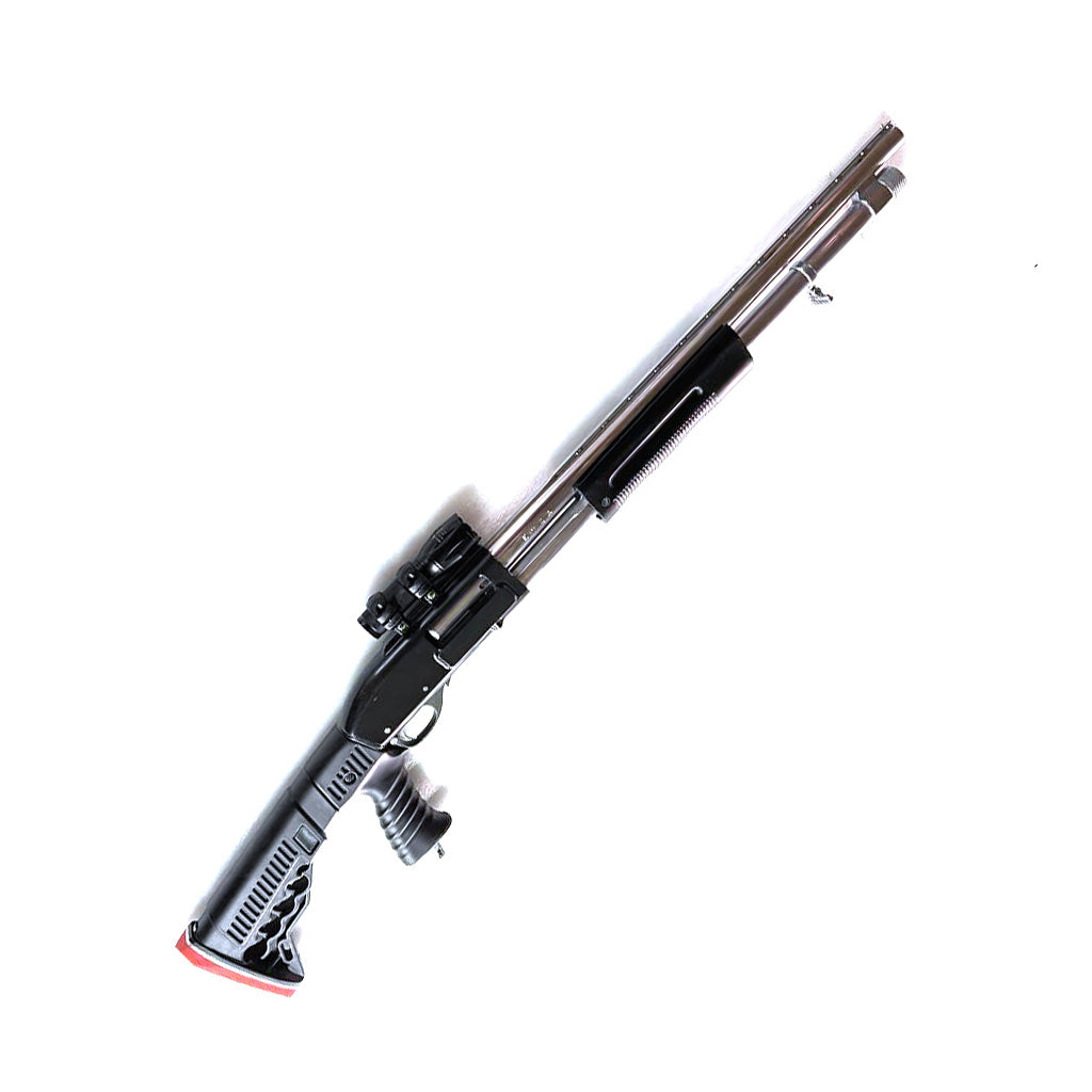 It is a 12 bore pump action gun made by new light art works in India. This repeater is operated by manual pump action. It has a tubular magazine with a capacity of 7+1 rounds which means you can load 7 rounds in magazine and 1 round in chamber. It has a railing attached to it for mounting a scope, laser light or other accessories. The Weapon is Capable of Firing both lethal and Non-lethal ammunition from a safe Distance.